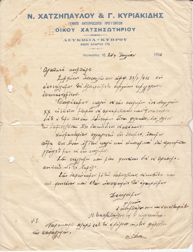 Hand written letter/receipt from Xatzipavlou spirits company dated 24/7/1936